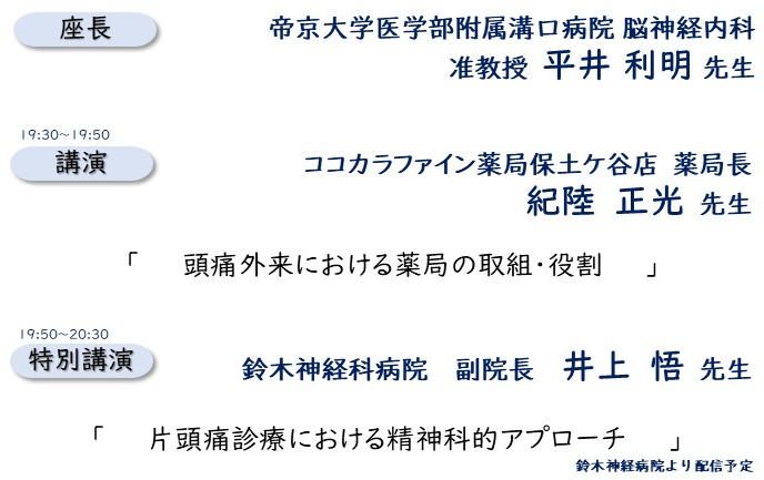 第2回神奈川頭痛ネットワークSeminarがありました。大塚製薬主催で、五十嵐久佳先生・秋山久尚教授が代表世話人です。今回、当院の運命共同体でもある、ココカラファイン保土ヶ谷店薬局長 紀陸正光先生と、茂原市の鈴木神経病院 井上悟先生(精神科・頭痛専門医)でした。