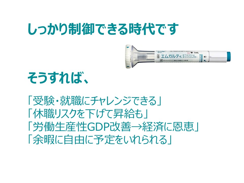この片頭痛に関するリテラシーを知ることは、まず治療医・患者さんの第一歩です。昨今社会保障給付費過剰の問題が医療崩壊の要因と考えられておりますが、CGRP薬は高額ですが、7割は社会保障費を財源としますが、3割は自己負担でありますし、働き世代が対象ですので、経済損失(仕事ができなくて付加価値が低下する)は改善するため、試算上は、社会保障費負担と給付のバランスにおいては、プラスと判断しております。古市先生も同様の御意見でした。状態の悪い片頭痛は、早期にCGRP薬を導入し、人生のダウンタイムを減らすべきと考えます。