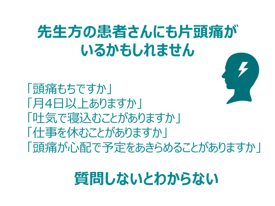 頭痛の患者さんがまず受診するのは50%はかかりつけ医であるというデータがあります。今回は、かかりつけ医でみる頭痛診療のポイントを一部、以下スライドに紹介します。質問してもらいたいこと、あるいは患者さん側は以下の問を医師に伝えてみてください。