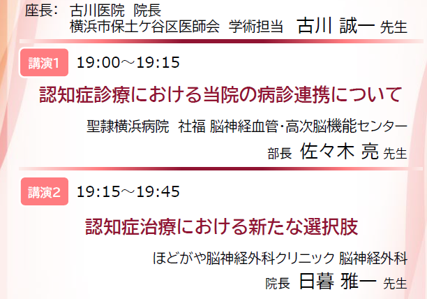 興和株式会社・横浜市保土ヶ谷区医師会主催、KOWA Web Seminar~認知症診療を考える~がありました。今回は、医師会学術担当の 古川医院院長 古川誠一先生に座長をしていただき、聖隷横浜病院脳神経血管・高次脳機能センター 部長 佐々木亮先生と、お話させていただきました。