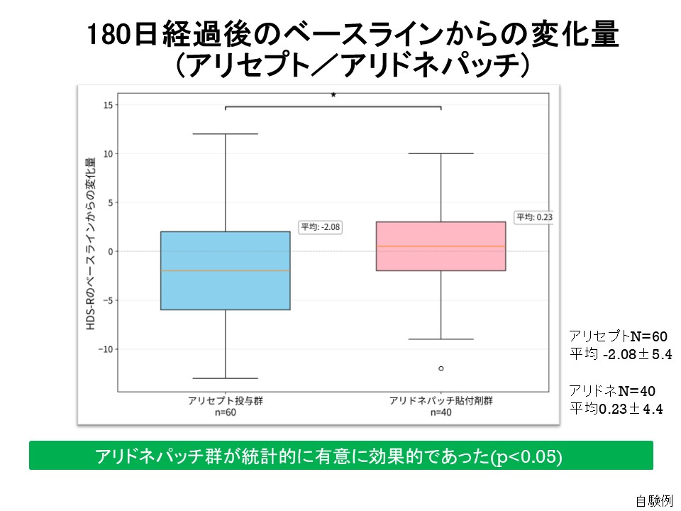 小生からは、アリドネパッチという、アリセプト(ドネペジル)の貼付版のお話をさせていただきました。上図にあるように、貼付を長く継続できた場合、半年間での長谷川式簡易認知症スケールでは統計学的優位に改善~維持という結果となりました。Nが少なく統計力不十分でもあり、あくまでも参考値として提示しました。